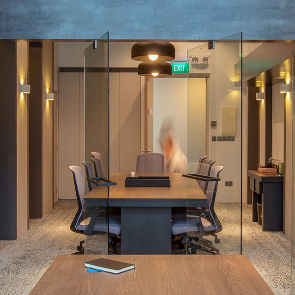 This project is the interiors of an office space for a trading company. The space the company had taken-up consisted of two bays combined and a double high ceiling height which became an important part of the concept.